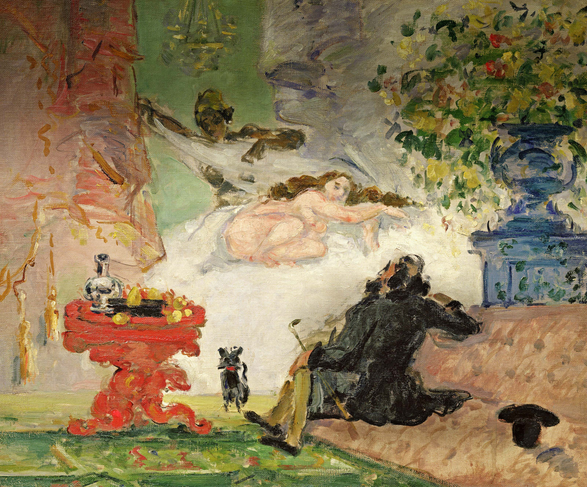 В 1860-е создатель «Олимпии» стал для молодого Сезанна ярким примером художника, исследующего новые возможности в живописи, которым не научат в Школе изящных искусств. Сезанну тоже были тесны академические рамки. Он написал несколько работ по мотивам поразившей его картины Мане. Финальный вариант появился в результате спора с другом, доктором Полем-Фердинандом Гаше: Сезанн воскликнул, что может создать такой же шедевр, как «Олимпия», на что собеседник заявил: «Так сделайте же это». В результате получилась картина, ставшая своего рода ответом знаменитому мастеру: более дерзкая и импрессионистская по исполнению, ироничная, но отдающая дань уважения живописи Мане.