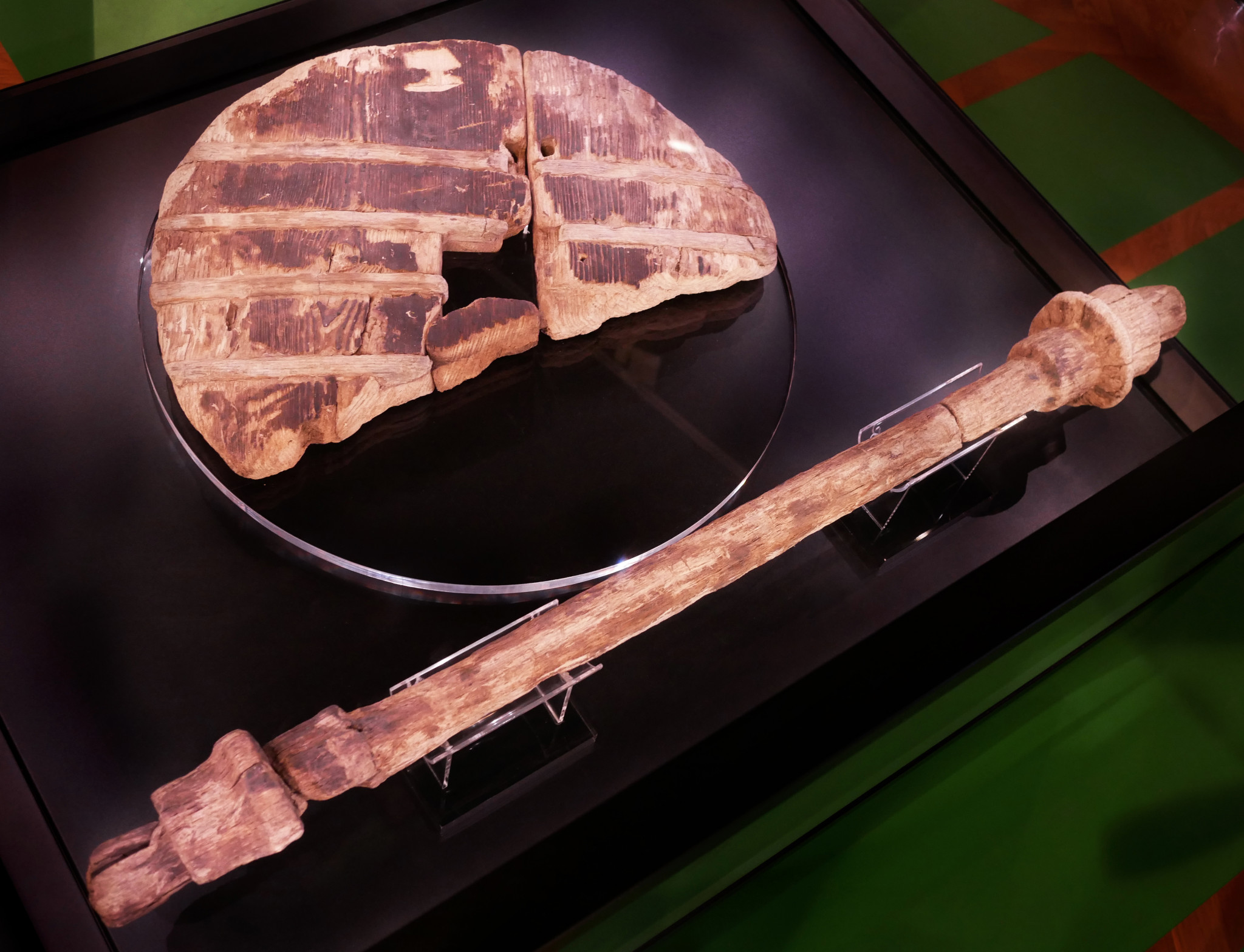 Частично сохранившийся колесный диск диаметром 72 см сделан из ясеня и составлен из двух досок, которые скреплялись металлическими скобами. В одной из частей – той, что побольше, – сделан квадратный пропил. В него вставлялась найденная рядом дубовая ось, которая фиксировалась дубовыми же клиньями.