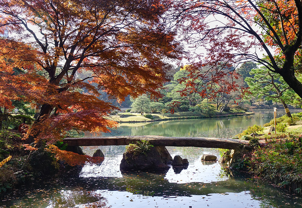 Так начиналась моя первая в жизни прогулка по японскому саду в Токио, куда погожим ноябрьским днем меня пригласили Сайто-сан с супругой. Беседуя, мы неспешно продвигались вглубь. «Взморье драгоценных водорослей», «Узорчатый камень слов», «Сосна, которую можно спросить о событиях древности» – мои японские друзья перечисляли поэтичные названия всего, что видели вокруг. Когда мы прошли по мосту «Пересекающего ночь лунного света», взору открылась блестящая от солнца гладь большого пруда. Над его поверхностью возвышались зеленые холмистые острова и причудливые валуны. В разговор вступила Сатико, миниатюрная супруга Сайто-сана. На прогулку по саду она пришла в кимоно, украшенном изображением золотых хризантем. Элегантно повязанный пояс оби был усыпан вышитыми разноцветными листьями японского клена – момидзи.