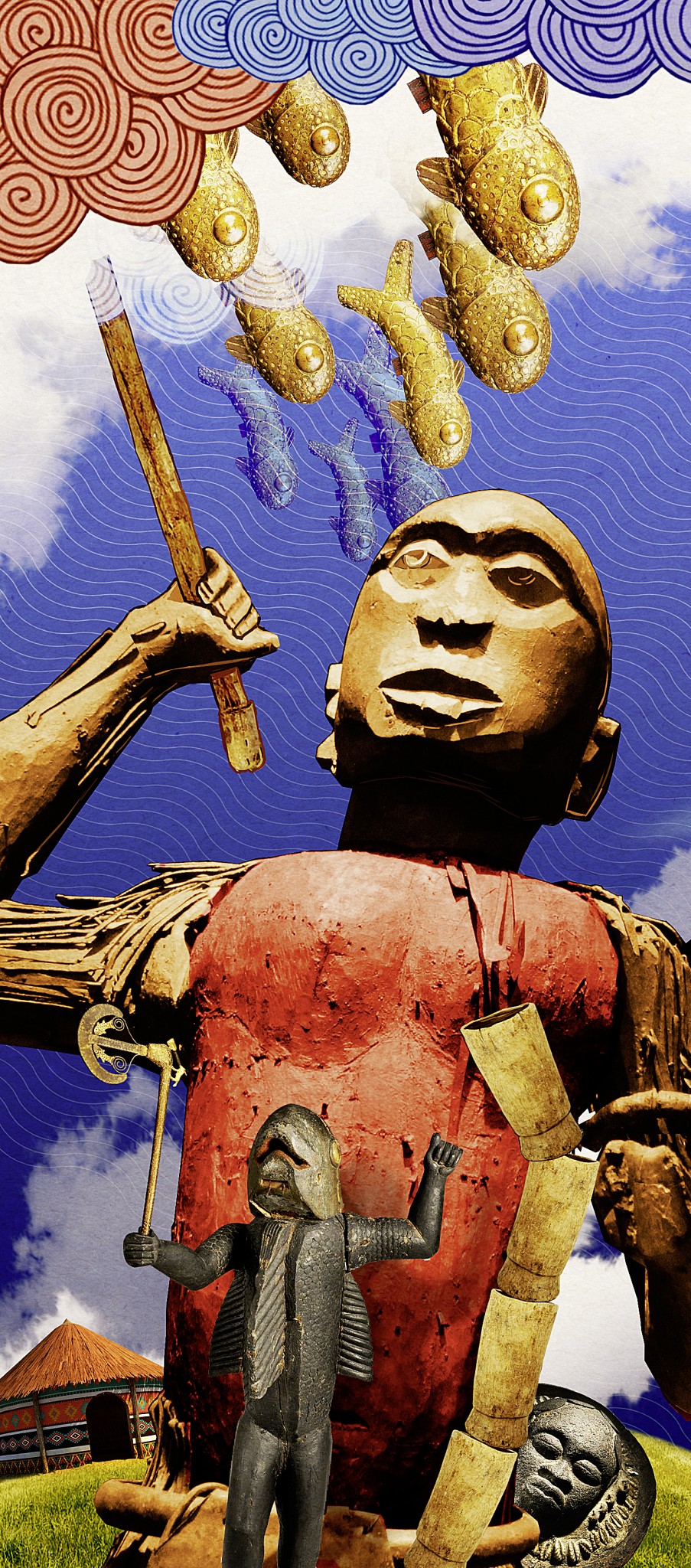 Когда Бог создал мир, он накрыл его Ниан-Купоном², чтобы защитить от непогоды. Ниан-Купон находился очень близко от земли, но люди были благоразумны и ходили на четвереньках, чтобы не повредить небесный свод. Довольный таким поведением Бог пожелал вознаградить их и наполнил Ниан-Купон рыбой, так что людям стоило только ударить в облако палкой, чтобы оттуда посыпалась рыба, подобно потокам дождя, несметное множество рыбы, которую людям оставалось только варить.