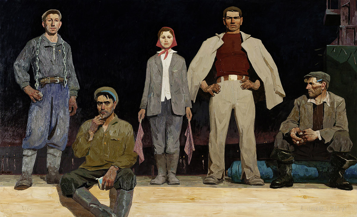 На картине, сделавшей его известным, Виктор Попков изобразил рабочих с Братской ГЭС. То был ключевой объект сибирского гидростроительства, развернувшегося в хрущевскую эпоху. Братскую ГЭС на реке Ангаре сооружали с 1954 по 1967 годы, и до 1971-го она была самой мощной в мире. По сей день Братское водохранилище считается вторым крупнейшим на земном шаре. Амбициозный строительный проект вызвал волну энтузиазма по всему СССР, на Ангару стекались тысячи добровольцев, которых не пугали суровые условия сибирской глуши, жизнь в палаточных городках, сильные морозы зимой, гнус летом…