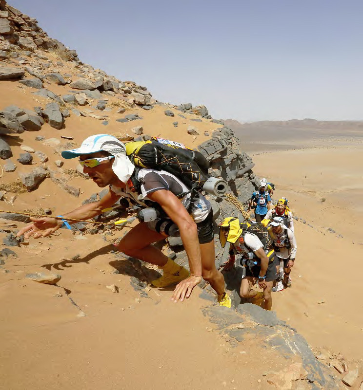 Проблема не только в жаре, но и в перепадах температуры: днем может быть +50 °C, а ночью холодает почти до нуля. Помимо этого, дискомфорт доставляет песок, который забивается повсюду: в глаза, рот, одежду, обувь. Если поднимается сильный ветер, нужно ждать затишья. Бежать приходится не только по песчаным дюнам, но и по каменистой местности с высокими скалистыми подъемами и спусками. Нужно беречь ноги: к вечеру они стираются в кровь из-за жары, пота и песка. Но самым тяжелым в моем изнурительном забеге был рюкзак за спиной! Он весил 35 килограммов и казался неподъемным.