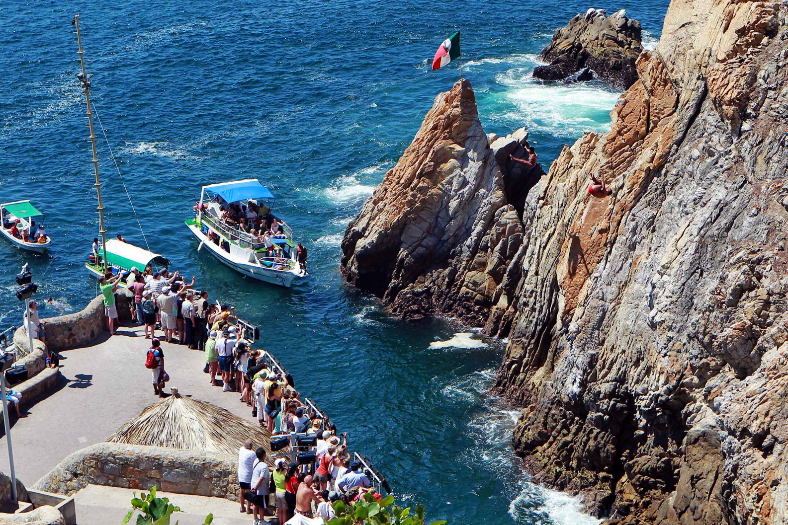 Океан, похоже, чем-то рассержен: волны цвета индиго разбиваются о подножие скал с каким-то особым неистовством. Скала Ла-Кебрада, всемирно известная достопримечательность Акапулько, в лучах послеполуденного солнца играет острыми рельефами и складками. На самом верху — человек, который кажется размером с игрушечного пупса. Площадка для зрителей расположена на скале поменьше, которую от Ла-Кебрады отделяет узкая, всего семь метров в ширину, заводь — в нее-то и ныряют клавадисты. Народу на площадке много: высокий сезон. Я приехала за 20 минут до начала представления, чтобы занять место получше, а те, кто пришли за несколько минут, предпочли подождать следующего шоу.