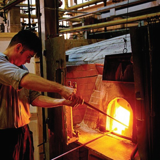 В помещении просторно, светло и на удивление малолюдно. На деревянном помосте в глубине цеха работает несколько стеклодувов в шортах и легких рубашках — жарко. Полыхает оранжевое пламя в жерлах печей, где плавится хрустальная масса, слышится плеск воды, которой подмастерья поливают стоящие у помоста деревянные формы. Мастер дует в длинную трубку, крутя ее в руках. На конце трубки постепенно увеличивается яркий шар стеклянной массы. Стеклодув изготавливает внешний, цветной слой хрустального изделия. Внутри этого слоя будет обычный прозрачный. Данная технология позволяет создавать прозрачный узор, прорезая цветной слой. Именно такой, накладной хрусталь — основная продукция завода.