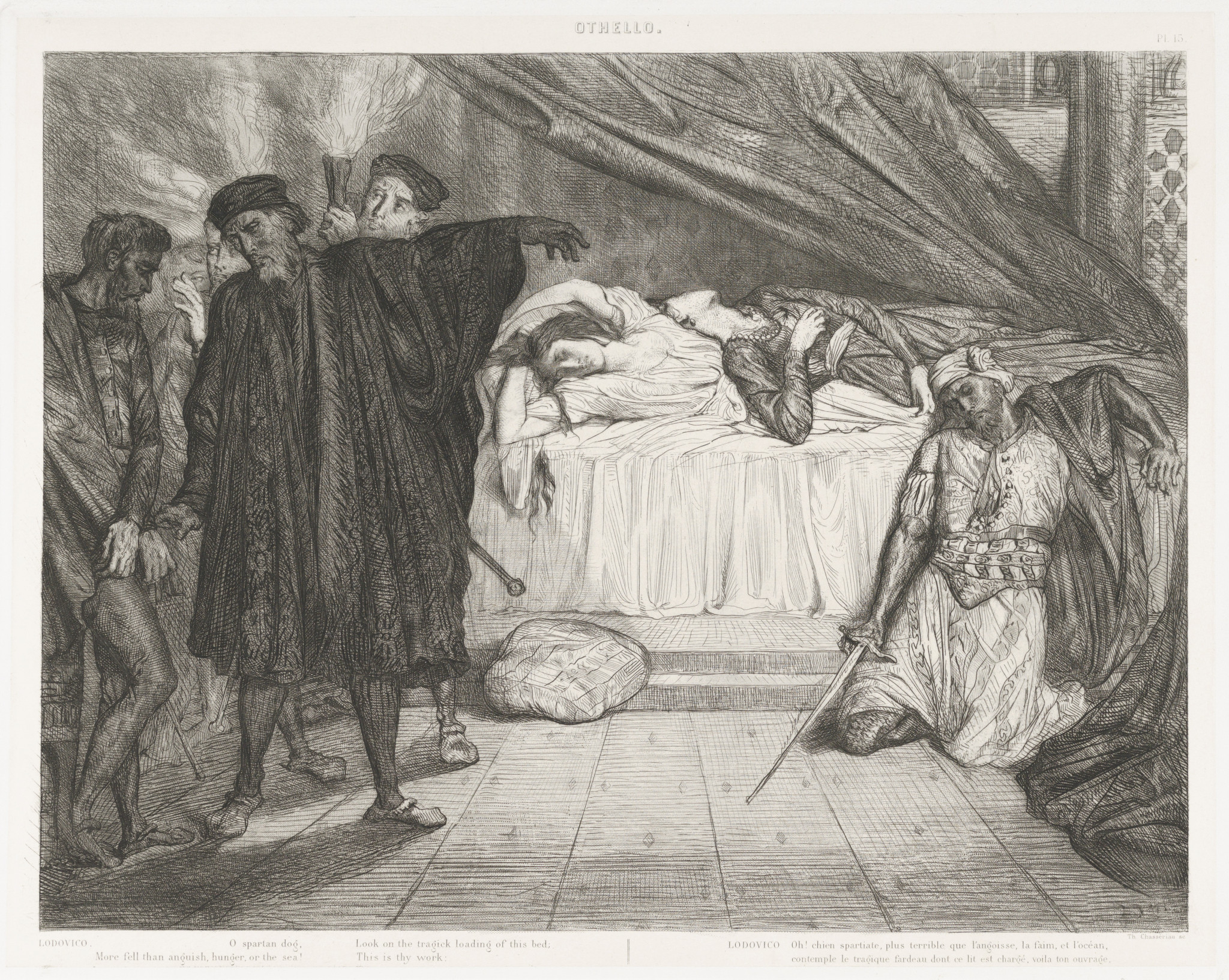 Надо сказать, сюжет Джиральди сильно отличается от шекспировского. Хотя там также действуют мавр Отелло и его поручик (в этой повести безымянный), последний безответно влюблен в жену капитана Дисдемону и затевает коварный заговор, прежде всего чтобы извести со свету предмет своего вожделения – что-то вроде «так не доставайся же ты никому». Убедив мавра в неверности жены, он наводит его на идею задушить предательницу, а вину свалить на лейтенанта, с которым у нее как будто и был роман. Для подтверждения своих слов он выкрадывает платок Дисдемоны, который подбрасывает лейтенанту, а затем помогает капитану расправиться с мнимыми изменщиками. В конце концов правда раскрывается, и Отелло вешают. Поручика тоже в итоге вешают, но за другие преступления.