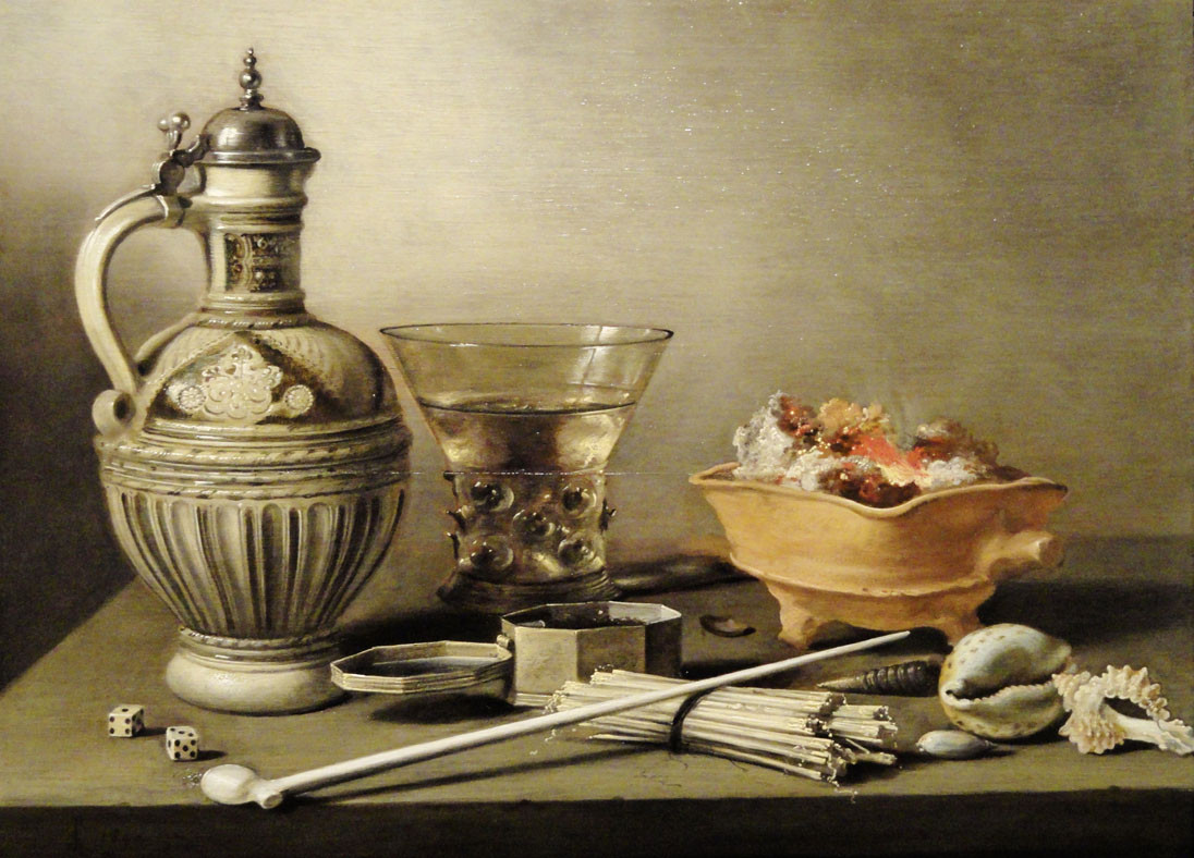 XVII век в Европе – время табака. «Бесовское зелье», за употребление которого ранее можно было попасть в тюрьму, с конца XVI столетия объявили лекарственным средством. Для нюхательного табака появились коробочки-табакерки – фарфоровые, слоновой кости, серебряные, золотые. Для курительного – мешочки-кисеты и глиняные трубки с маленькой чашей (табак был дорог) и длинным чубуком. В натюрмортах и жанровых композициях «ванитас» трубки напоминают о тщете сущего и своей непрочностью, и тем, что курение – суетное удовольствие смертных, и тем, что табак сгорит, а трубка погаснет – так проходит и жизнь человеческая.
