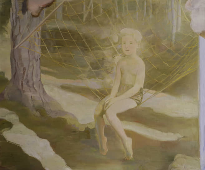 Таня Рауш коллекционирует изображения детей: фотографирует сама, выбирает снимки из семейных архивов, покупает старые карточки на барахолках и аукционах. И переводит фотографии в живопись так, что в переводе теряется все сиюминутное и проступает сущностное. Кургузые пальтишки, меховые шапочки, валенки с галошами, сандалики с носочками, рейтузы, чулочки, салазки и лошади-качалки, пупсы и мишки, судорожно прижатые к груди как последняя защита и опора,— те атрибуты времени, что пойманы на снимках, сохраняются и в картинах. Но дети, часто являющиеся на золотых иконных или облачных апофеозных фонах, из своего конкретного времени выпадают. Выпадают они и из земной реальности, теряют объем и цвет, уплощаются и развоплощаются, попадая в реальность другого порядка. Акт перевода равен акту трансфигурации: выхваченные из смертного существования, они преображаются к жизни вечной.