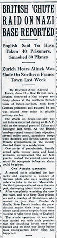 В заметке сообщалось, что несколькими днями ранее парашютисты-десантники Королевских военно-воздушных сил Великобритании высадилась на севере Франции в коммуне Берк-сюр-Мер. Они разделились на три небольшие группы. Первая, вооруженная автоматами и ручными гранатами, разоружила охрану немецкого аэродрома и захватила диспетчерскую — операция была проведена так стремительно, что немцы даже не успели поднять тревогу. Вторая группа оперативно зачистила казармы и взяла в плен 40 немецких пилотов. Третья группа рассредоточилась по базе и вывела из строя около 30 боевых самолетов. Эвакуировались десантники с пленными с помощью моторных катеров через Ла-Манш. В результате рейда ни один десантник не пострадал, помогали британцам французские партизаны.