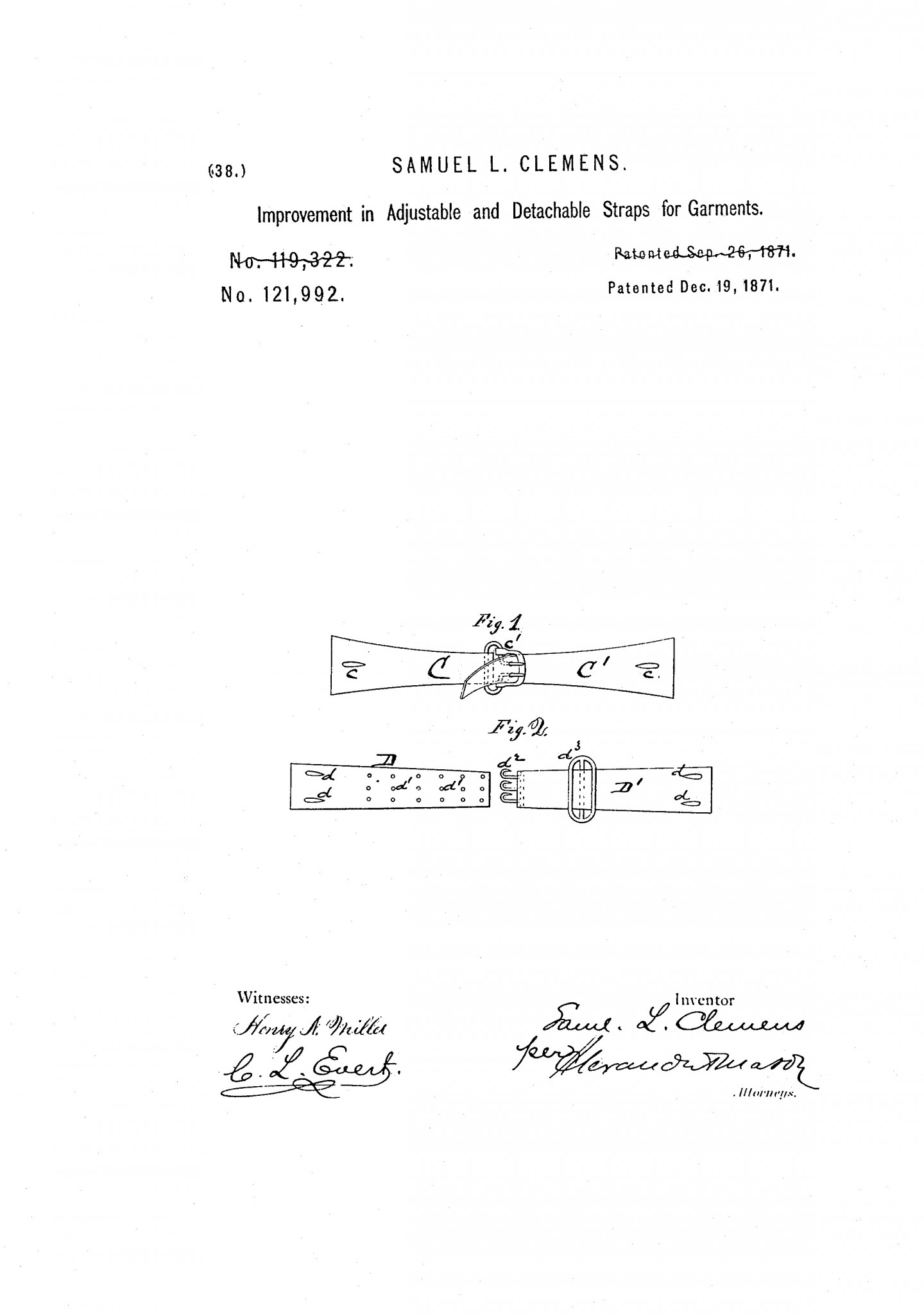 Марк Твен изобрел и даже запатентовал вещь, которую сам назвал «усовершенствованные регулируемые съемные ремни для одежды». Твен считал подтяжки неудобными и придумал им альтернативу в виде небольшого эластичного ремешка с застежкой, который прикреплялся на брюки и утягивал их, чтобы они плотнее держались. В качестве замены подтяжек устройство Твена не приобрело популярности, зато на основе именно его патента впоследствии была разработана застежка для бюстгальтера. Эластичный ремень был не единственным запатентованным изобретением Твена: еще он придумал альбом для вырезок с клейкими листами. Эта технология оказалась вполне популярной и принесла Твену прибыль.