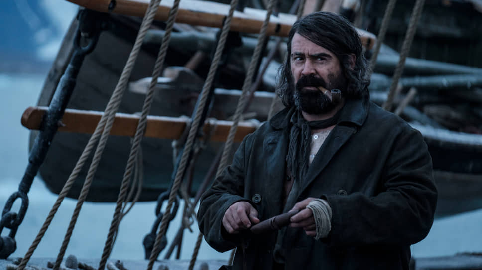 «Северные воды» — это никогда не замерзающая полоса открытой воды между Канадой и Гренландией, то есть по-нашему — арктическая полынья. Туда в 1859 году из английского порта Халл направляется китобойное судно «Охотник» под командованием опытного капитана Браунли (Стивен Грэм) с разношерстной командой на борту, наполовину состоящей из всякого сброда. Но даже на таком фоне особенно выделяется гарпунщик Генри Дракс (Колин Фаррелл, заросший бородой по самые брови) — зловещий персонаж с темным прошлым: ходят слухи, что он прожил несколько лет среди каннибалов на островах Океании. Благодаря своей профессии он обладает огромной силищей и при этом совершенно лишен нравственного начала, что делает его человеком, мягко говоря, опасным. Кажется, что такой типаж автор одноименного романа Иэн Макгуайр срисовал прямиком у Конан Дойля из рассказа «Черный Питер» (русский перевод вышел в том же 2016 году, что и оригинал, и называется «Последний кит. В северных водах»).