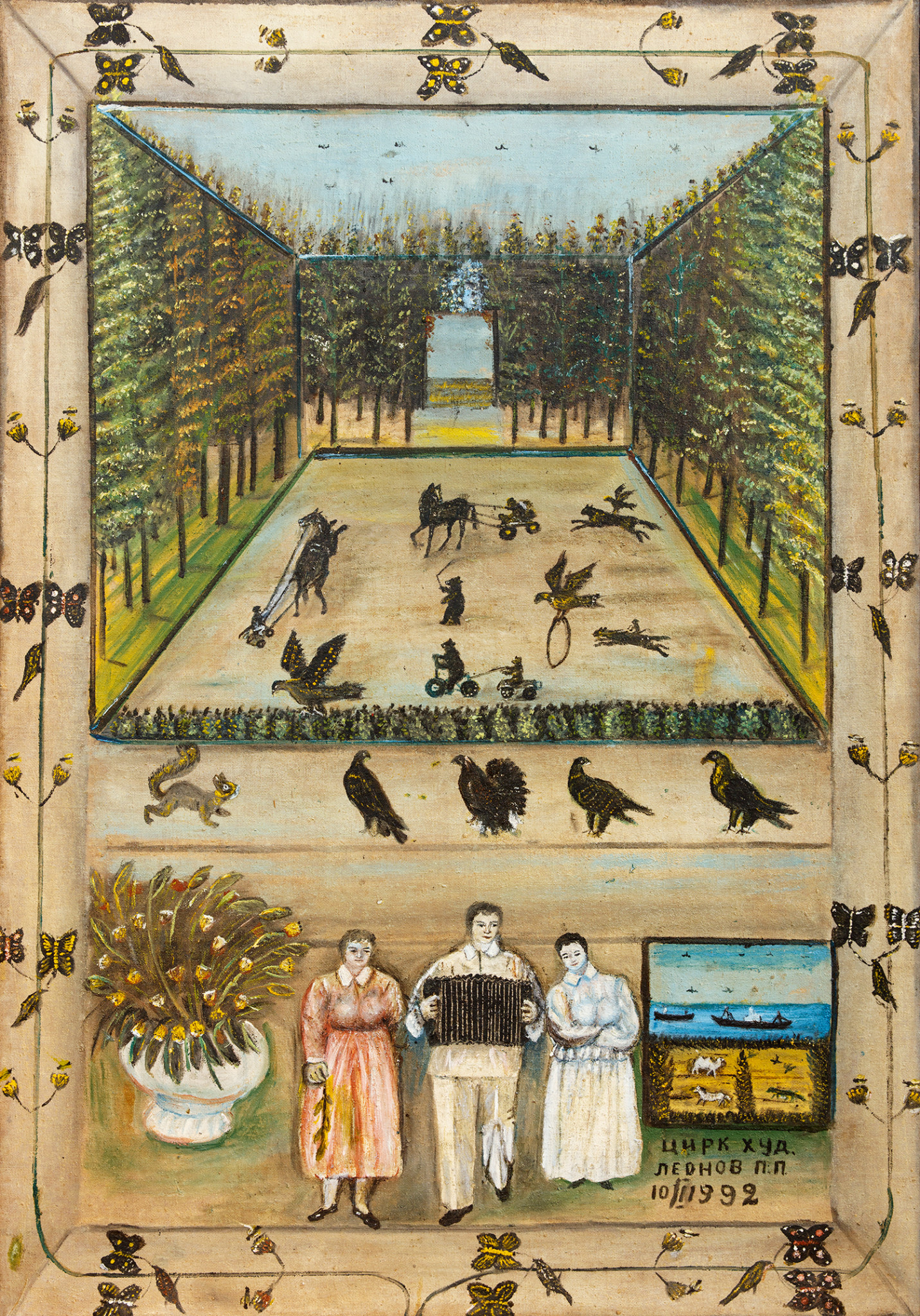 Заборно-избяная архитектура выставки — грубо обструганные доски и мешковина — оживлена аудиосопровождением: тут и там расставлены старенькие радиоприемники, главное средство массовой информации в советской деревне, и из них доносится надтреснутый старческий голос художника, мастера петь частушки. В этих интерьерах якобы более органично смотрится живопись Леонова, особенно — картины его фирменного «коврового» стиля, представляющие бесконечный праздник райской колхозной жизни. Летят самолеты, вертолеты и перелетные птицы, плывут пароходы, киты и весельные лодки, скачут всадники, северные олени и волки, бегут автобусы, машины и подводы-колесницы, в поля выходят комбайны, в леса — охотники, пляшут на свадьбах колхозники и колхозницы — весь мир движется и одновременно пребывает в неподвижности, как и полагается орнаменту. Вульгарная политология скажет, что это советский строй научил леоновских гусей, медведей и сайгаков маршировать строем по линейке, что это социалистический реализм заставляет художника переносить в образцовый колхоз клуб с колоннами, фонтаны и карусели из соседнего райцентра и что это советская культпросветработа приводит видных советских писателей Пушкина, Льва Толстого и Есенина на деревенские танцы. Неправда — это все логика орнамента и красоты. Тут полагается вспомнить, что и ковер — в самых разных традициях — есть образ мироздания и образ рая, и восхититься тем, как, продираясь сквозь лубок, продукт городской культуры Нового времени, и сквозь реалии советского культурного строительства, крестьянский художник пробивается к пластам древнейшей орнаментальной изобразительности.