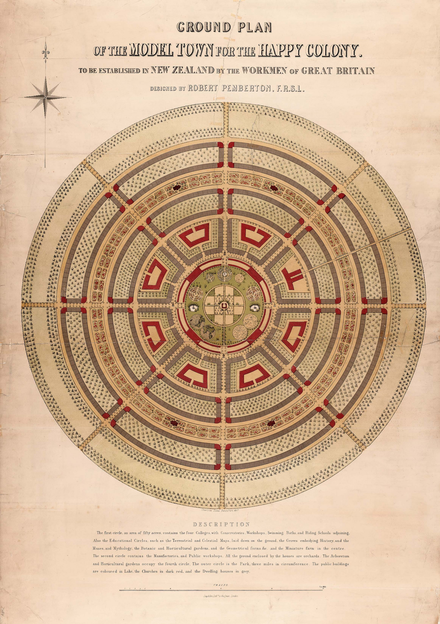 Книга «Счастливая колония» Роберта Пембертона появилась в 1854 году. Она состоит из трех частей, двух диалогов и одного манифеста. Первая часть — диалог между Пембертоном и его учеными друзьями о человеке, собственности и труде; вторая — воображаемая встреча Пембертона с делегацией представителей английского пролетариата по вопросу о переселении в Новую Зеландию, градостроительстве и образовании; и третья — описание нового поселения, прежде всего его центрального учреждения, Академии Рая (Elysian Academy). Этот труд сопровождался эскизным проектом, созданным архитектором Робертом Вильямом Армстронгом, однако его роль в данном случае скорее техническая, чем творческая — Пембертон предписывал ему, что рисовать, и очень подробно.