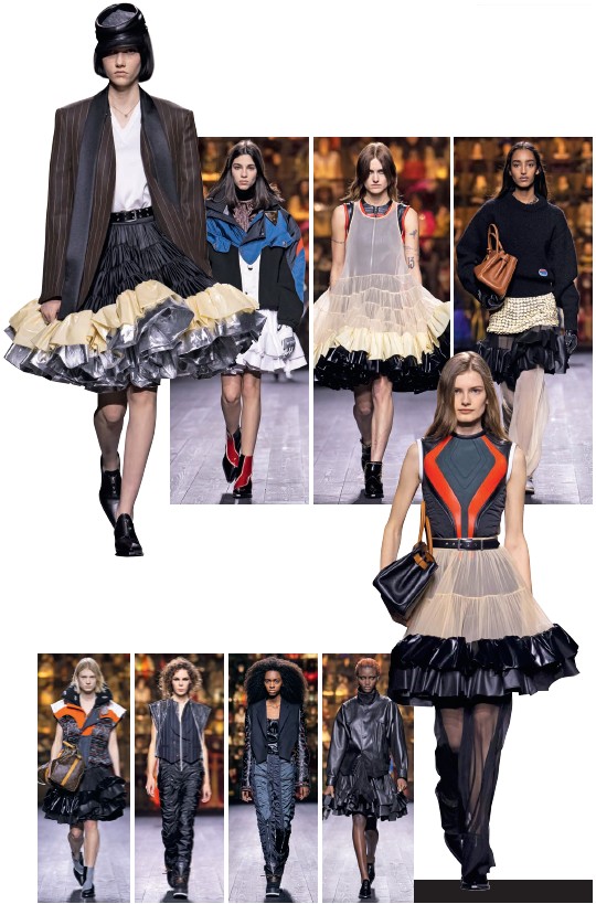 В нынешней коллекции Louis Vuitton эта любовь к монументальному представлению о времени особенно актуальна еще и потому, что Николя Гескьер был соавтором гала-приема в Met, а LV спонсировал выставку нью-йоркского Института костюма «О времени: мода и продолжительность». Прием не состоялся из-за пандемии, настоящее победило. Но посвященная долговечности и одновременно
