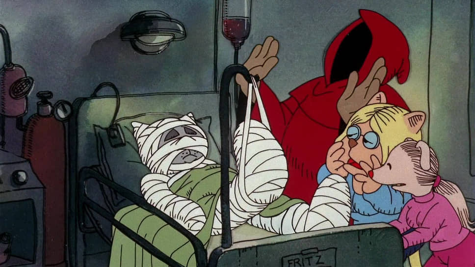 «Девять жизней» вышли в 1974-м, а до того, в 1972-м, были «Приключения кота Фрица». И вот там — полный набор: хиппи, свободная любовь, не особенно плавно переходящая в дикие оргии, полиция, погони, леваки-террористы, мечтающие покончить с миром безудержной эксплуатации... «Приключения» — режиссерский дебют Ральфа Бакши, который до того пробовал себя как мультипликатор, делал рекламные ролики для Coca-Cola и жил припеваючи, а потом вдруг осознал, что не очень ловко жить припеваючи, когда твоя страна ведет бессмысленную и несправедливую войну на далеких берегах, да и внутри твоей страны справедливости не очень много. К тому же Бакши наткнулся на комиксы Роберта Крамба про кота Фрица — жесткая графика и еще более жесткая социальная сатира.