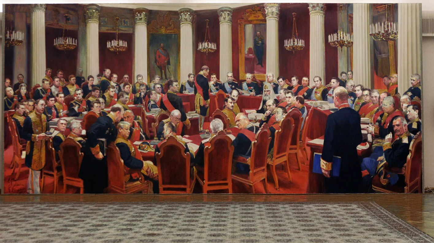 Осенью 2004 года в Московском музее современного искусства на Петровке открылась выставка одной картины, точнее — мегакартины. Публике впервые было явлено во всей красе огромное, размером 4 на почти что 9 метров полотно «Заседание Федерального собрания» кисти московских художников Сергея Калинина и Фарида Богдалова: оно представляло собой ремейк «Торжественного заседания Государственного совета 7 мая 1901 года», на котором тогдашняя политическая верхушка России представала в образах царских сановников с репинского портрета. Что Калинин и Богдалов трудятся над вольным парафразом «Заседания Государственного совета», приуроченным к столетию картины, стало известно за несколько лет до того: проект широко рекламировался; эскизы и этюды, а Калинин с Богдаловым по примеру Репина написали множество этюдов, еще в 2003-м выставлялись в One Work Gallery и продавались на «Арт-Москве» и «Арт-Манеже»; один из портретов патриарха Алексия II, благословившего живописцев на их богоугодный труд, ушел аж за $50 тыс. Но результат разочаровал практических всех: одних сразу, других — позднее.