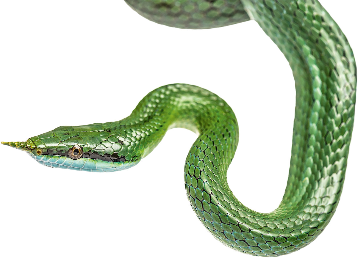 А еще носатого полоза можно называть ринхофисом — это от латинского названия. Но куда интереснее другие, придуманные народом, имена этой странной рептилии — кто–то зовет ее буратиной, кто-то зеленым единорогом, то-то змеей-носорогом… Хотя называть вот это вот «рогом» никак нельзя, потому что любой уважающий себя рог должен быть твердым и острым, а то, что отрастил себе наш полоз, не твердое, не острое и ни капельки не опасное. Видимо, это просто украшение такое — носили же восточные владыки крайне неудобные тапочки с нереально узкими, длинными, задранными вверх носами? И чем наш полоз хуже? К тому же наличие длинного, загнутого носа придает лицу полоза совершенно не змеиное выражение — если смотреть на него в фас, он кажется улыбающимся буквально от уха до уха.