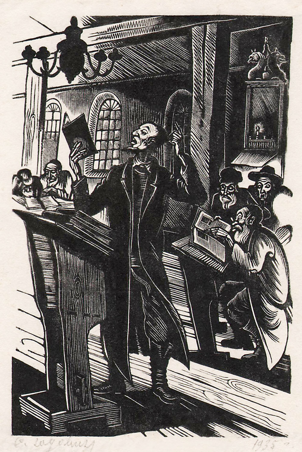 Во многом этот способ определяется самой камерностью выставки в муниципальной галерее, не имеющей финансовых и экспозиционных возможностей, чтобы привлекать первостатейные работы из федеральных музеев. В состав экспозиции вошли вещи из частных коллекций, с которыми по большей части работает Надя Плунгян, Музея истории евреев в России и других музеев столицы и области, в том числе Московского музея современного искусства (ММСИ). С его собранием и был связан скандал, последовавший за вернисажем и выплеснувшийся из соцсетей в открытое информационное пространство: Константин Акинша, видный эксперт по криминальной истории искусства, от перемещенных ценностей до подделок, выступил в «Артгиде» с заявлением о том, что представленная на выставке «Композиция» Ильи Чашника относится к числу более чем сомнительных, как и ряд других полотен из музейной коллекции авангарда. Из малоубедительной аргументации Плунгян, приведенной «Артгидом» вместе с текстом Акинши, так и неясно, зачем было брать на выставку не пользующуюся доверием специалистов картину «первого ряда», тогда как вся она построена на таком искусстве, какому обычно отводят «задние ряды». Но это единственная логическая непоследовательность куратора, программно обращающегося к материалу «маргинальному» и «второстепенному», поскольку то, что вытеснено на края, порой больше говорит о культуре эпохи и отдельных художественных явлениях, чем то, что помещается в центре на пьедестале. К тому же выставочный нарратив мастерски строится на взаимоотношении этих «маргиналий» и богатой книжной коллекции, при помощи которой в мельчайших подробностях — вплоть до сложения советского интеллигентского культа Гейне или марксистских разоблачений классовой природы антисемитизма — воссоздается весь исторический фон времени.