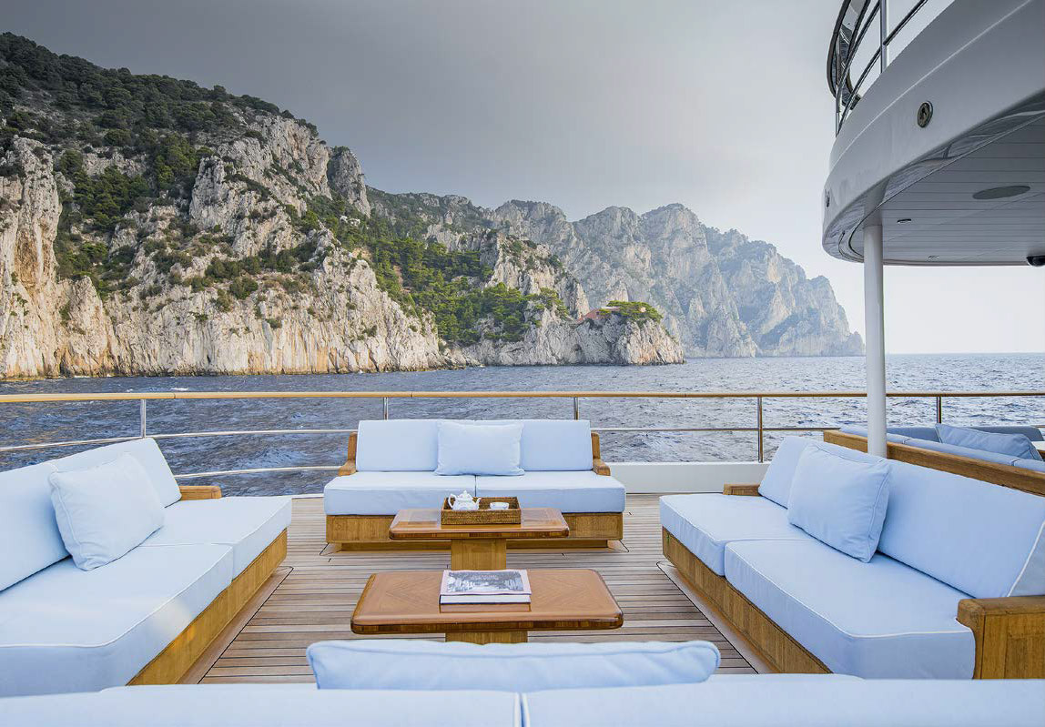 Помимо надстройки, где характерная и строгая яхтенная архитектура прошлых лет выражена в форме окон на трех ярусах, в плоской крыше ходовой рубки на палубе мостика и деревянных конструкциях, морские традиции прослеживаются в тотальном доминировании тика на палубах и даже в отдельных деталях. Я имею в виду световые люки на фордеке — не современные скайлайты заподлицо с палубой, но объемные конструкции из дерева и стекла, а также хромированные вентиляционные трубы с приемным дефлектором (давно таких не видел). Но давайте прогуляемся по всем палубам.