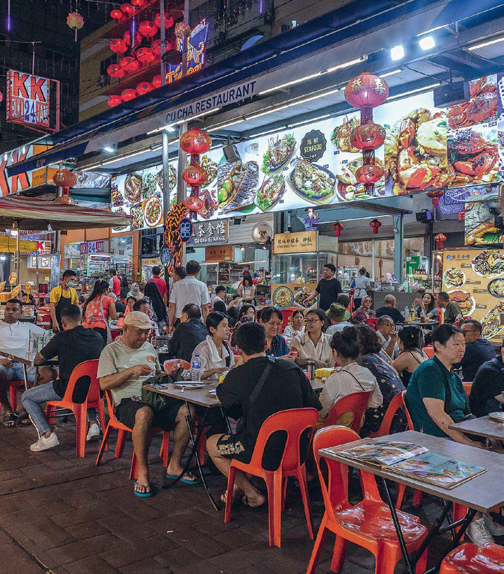 Бесцельно прогуливаясь по старому центру, сворачивая в переулки с Армянской улицы, но все равно оказываясь каким‑то чудом на ней снова, периодически останавливаешься у повозок со стритфудом. То хочется на ход ноги где‑нибудь на перекрестке улиц Карнавон и Кэмпбелл попросить Char Koay Kak (рисовый пирог с редькой и креветками) у милой старушки, то решиться попробовать дуриан. Продавец выберет огромный колючий фрукт, постучит по нему ножом и ловко разделает. То тянет укрыться в прохладе кофейни Toon Leong или культовом заведении China House и отведать Kopi Peng — ледяной местный кофе, хотя более популярен White coffee — напиток со сливками. Остров Пенанг, внесенный в список ЮНЕСКО, славится своей кухней. Если в одном из книжных открыть кулинарную книгу, полистать картинки и бегло почитать рецепты, станет понятен гастрономический масштаб. Здесь вообще любят поесть, и от осмотра достопримечательностей легко отвлечься на очередной перекус. Впрочем, это и есть идеальный план прогулки по Джорджтауну: немного исторических фактов, почерпнутых в форте Корнуолис и Голубом особняке Cheong Fatt Tze, музее, посвященном наследию Пенанга (кстати, здесь снимали сцену с игрой в маджонг в фильме «Безумно богатые азиаты»), немного уличной сувенирной суеты в Чайнатауне или Маленькой Индии, немного веры в хорошее в самом большом в Малайзии буддистском