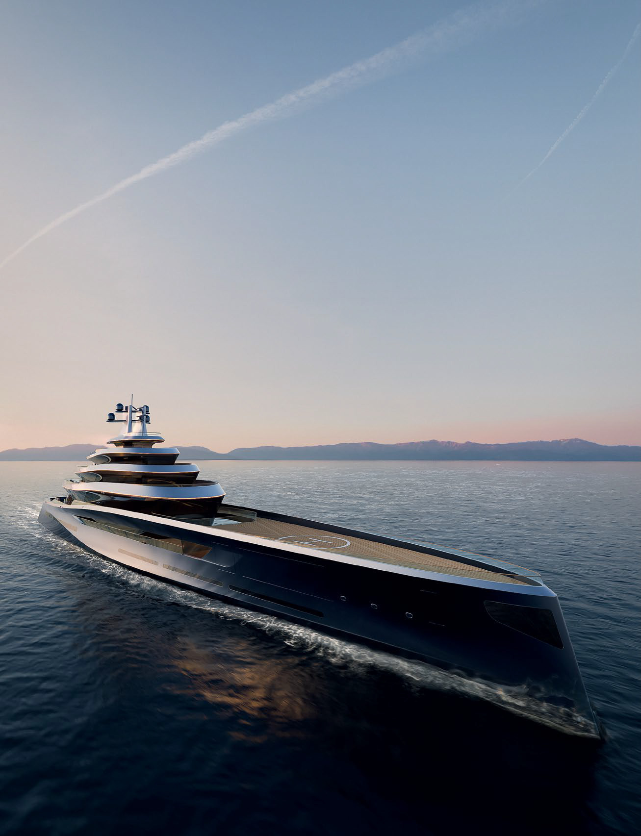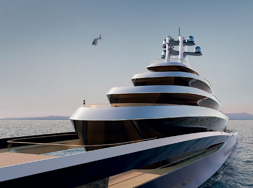 Чтобы полностью оценить замысел Джайлза Тейлора, стоит взглянуть на яхту сверху. Обратите внимание: все открытые палубы как минимум двухуровневые. Это важный момент, ведь все последнее десятилетие нам рассказывают о том, как здорово жить на лодке с минимумом ступеней. Тейлор рассудил иначе и подает многоуровневость как преимущество.