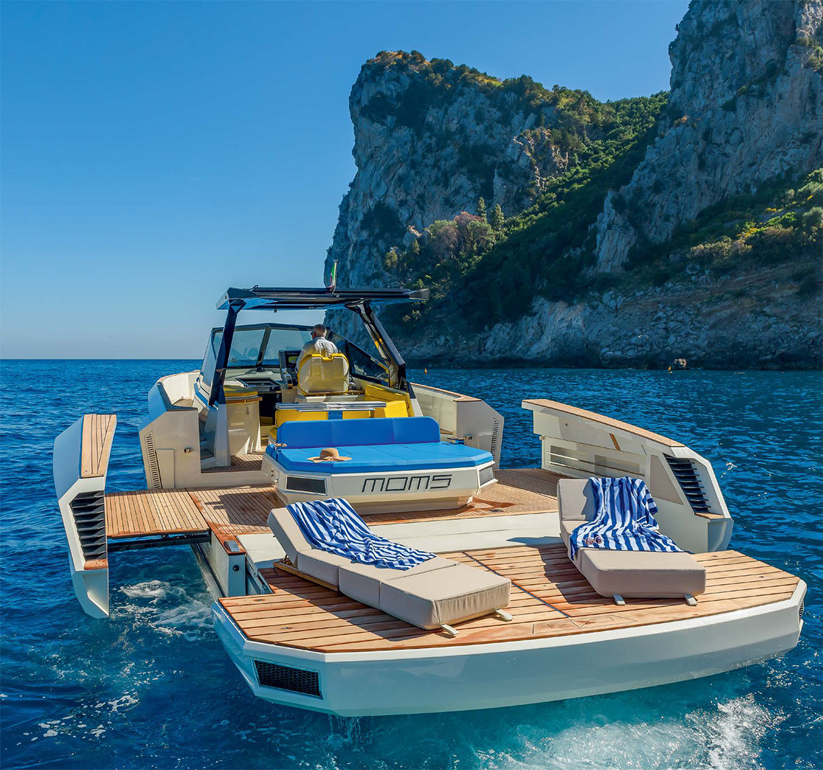 Раздвигающиеся сервоприводом борта увеличивают габаритную ширину корпуса на метр с каждого борта и пляжную зону до 25 кв. м; при этом мы не видим страховочных тросов, как на моделях других брендов с подобными конструкциями. Что касается кормы, то, в отличие от проектов Evo R4 и Evo R4WA, где транцевая платформа включала в себя известную конструкцию Besenzoni с площадкой и ступенями, способную как погружаться под воду, так и служить трапом на высокий причал, здесь «работает» вся платформа.