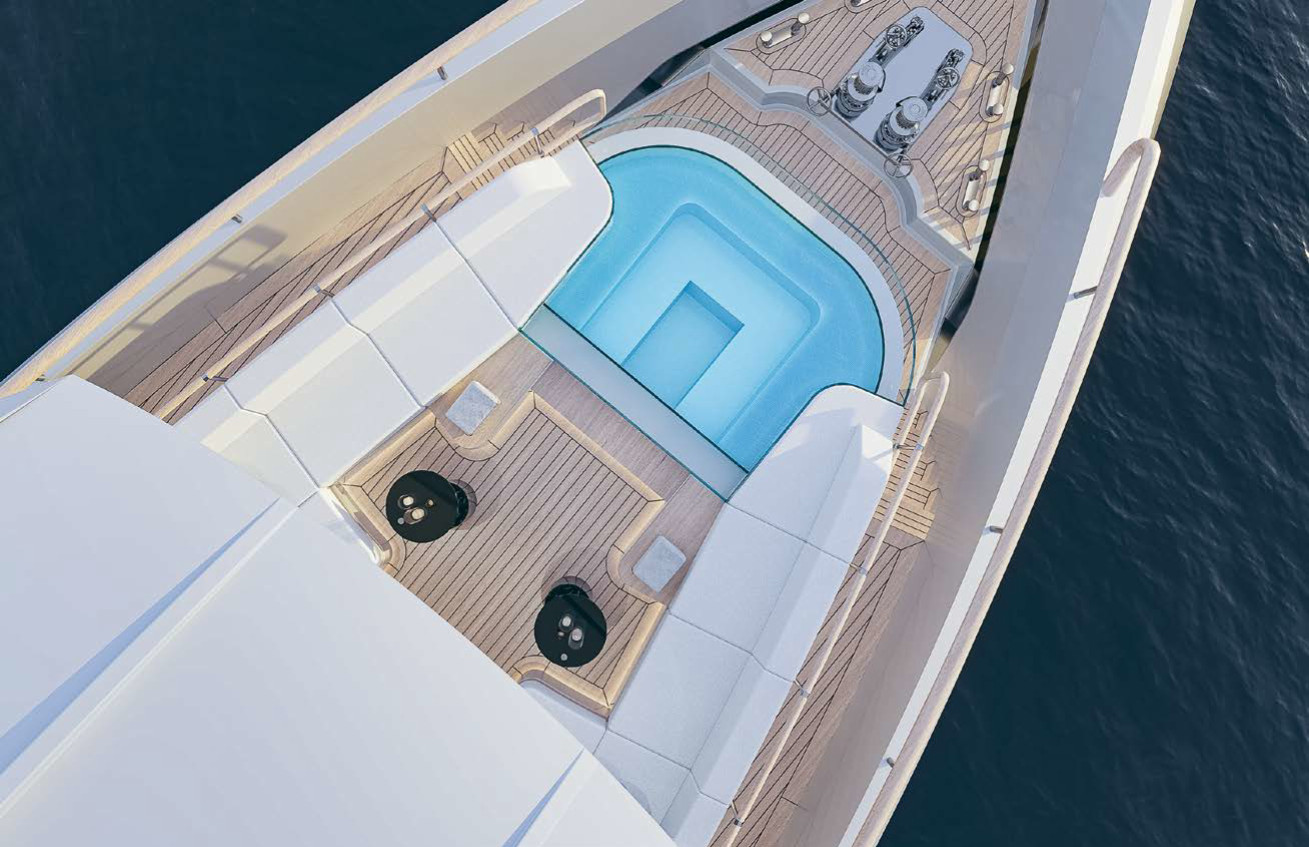 Это судно с отвесным форштевнем, высоким бортом до миделя и протяженной открытой палубой в корме будет выделяться не за счет вычурных деталей экстерьера: оно захватывает внимание сбалансированной целостностью и какой-то внутренней силой. Дизайнеры предложили ряд оригинальных решений, которые заметны на каждой палубе. Я уже писал об этом (в частности, в статье «За три моря», Y Magazine № 2/2024), но сейчас обнаружил в проекте некоторые отличия от первоначальной концепции.