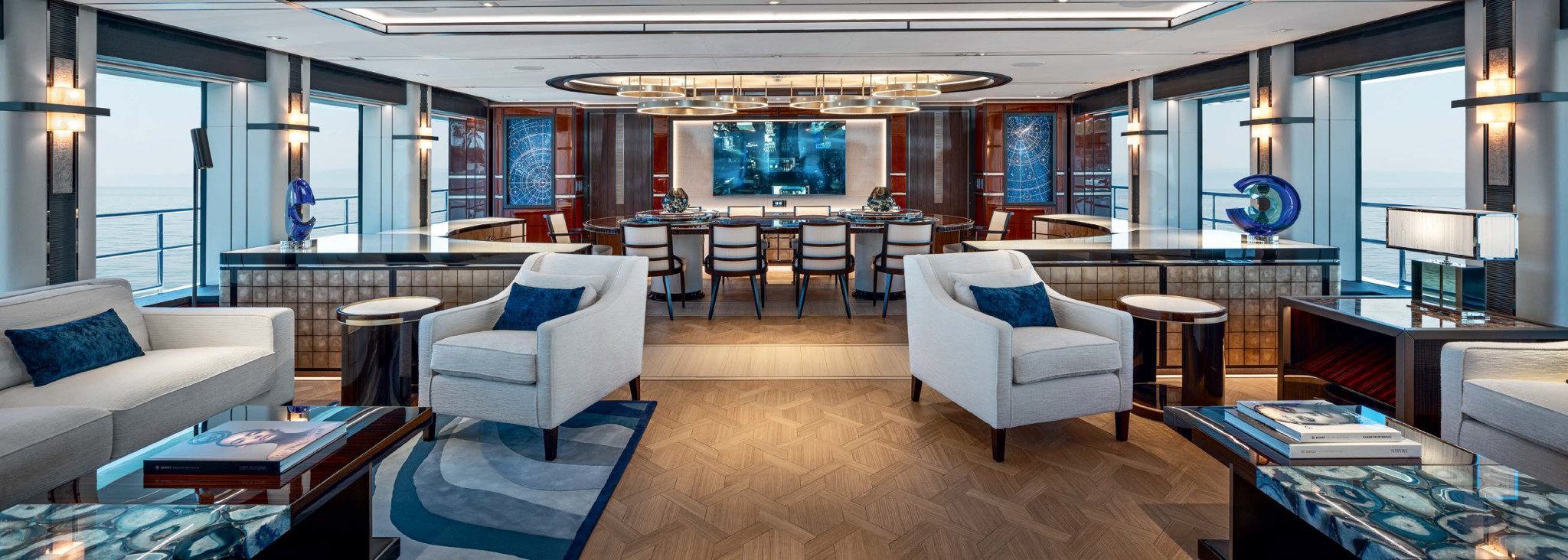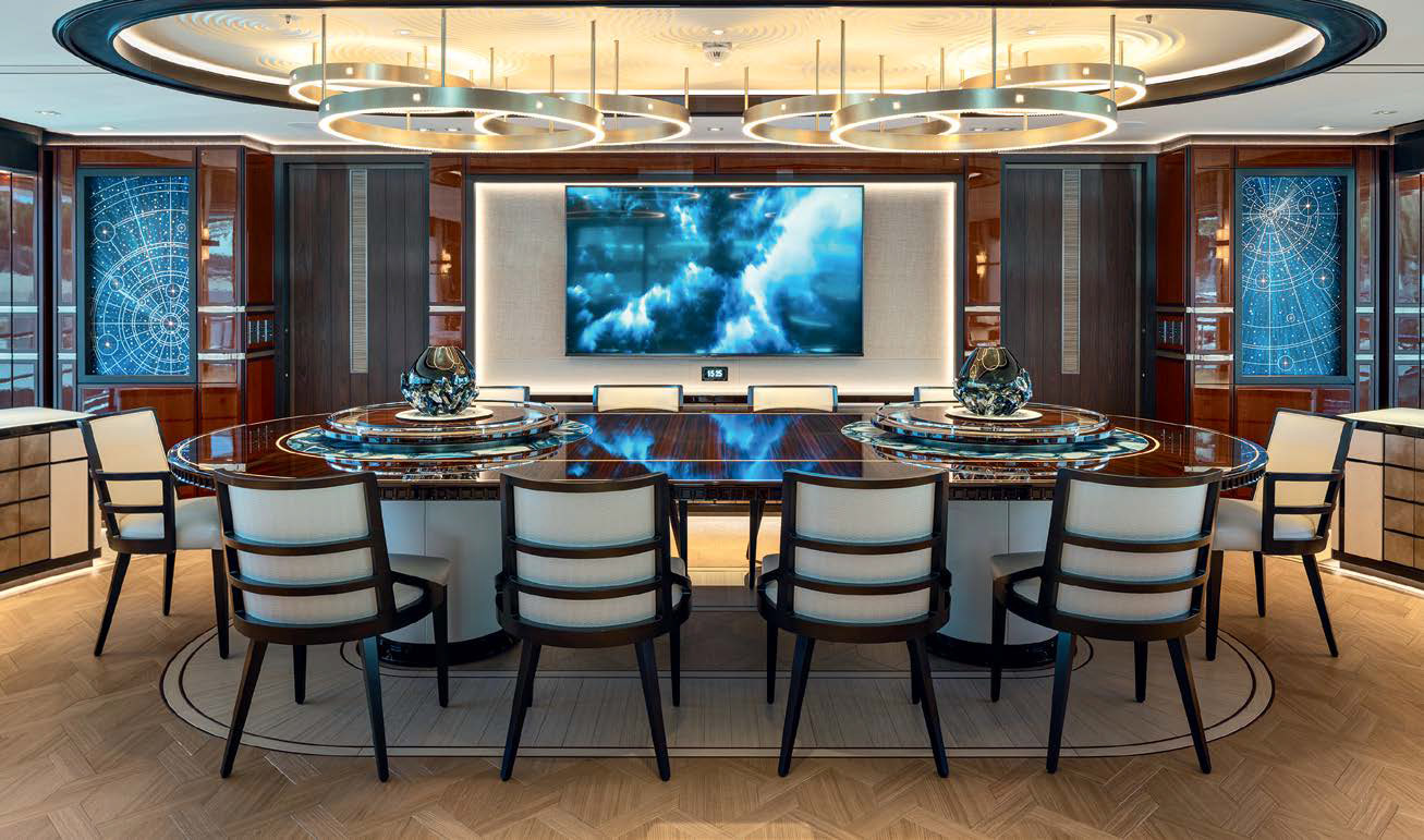 Все открытые участки тиковых палуб организованы весьма рационально. Перед надстройкой на сандеке есть зона отдыха с диванами и креслами, на фордеке (верхняя палуба) есть такая же, но побольше; в самом носу — зона ответственности экипажа с двумя мощными якорными шпилями и швартовным устройством. В кормовой части находится терраса с джакузи, примыкающая к апартаментам владельца (о них будет дальше), а на главной палубе в корме дизайнеры поместили обеденную зону на открытом воздухе (но под защитой сверху) и большой диван. И, конечно, просторная кормовая платформа-«пляж».