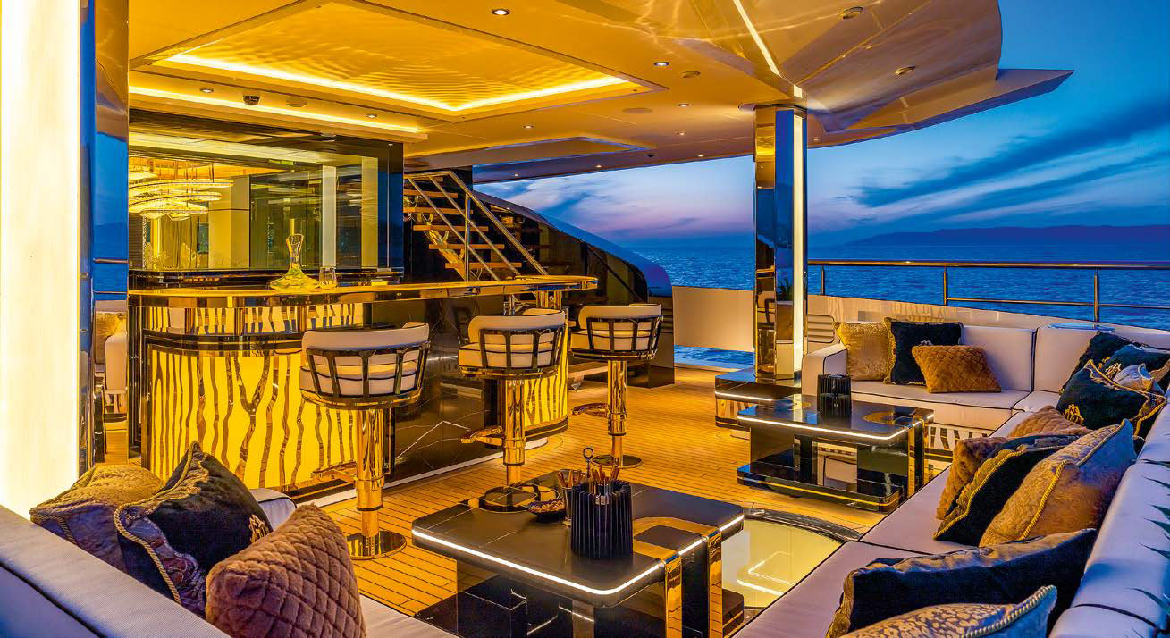 Помимо салона, на главной палубе находятся облицованный «латами» из нержавейки камбуз, примыкающий к нему сервировочный буфет, центральное лобби и две одинаковые по площади, но не зеркальные VIP-каюты. У гостей есть выбор: перемещаться между «этажами» на лифте или по центральной лестнице. Перед нами тот случай, когда второй вариант гораздо интереснее. Почему? Потому что мраморную лестницу с дизайном от Lithos окружает необычный «колодец» — стена с пузырьками, которую придумала флоридская компания Blueworld. В закрытом контуре стеновых панелей находится дистиллированная вода, и, поскольку туда не попадает солнечный свет, она не цветет. На лифте, впрочем, тоже стоит прокатиться, так как здесь это не скучная прозрачная капсула, но своеобразный «золотой саркофаг».