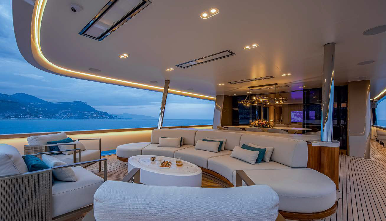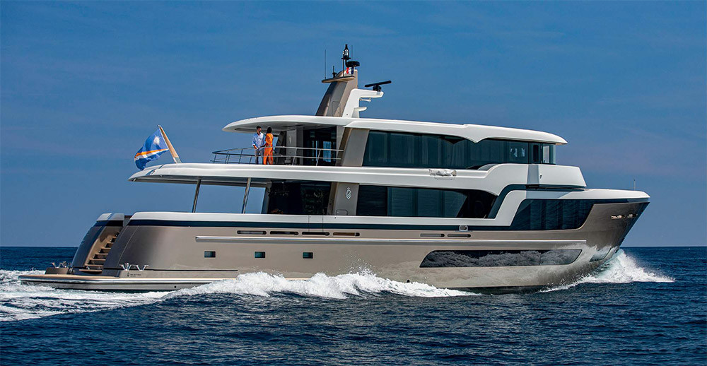 В итоге яхта, которую Гвидо де Грут охарактеризовал как «большую и сложную лодку, весьма удивительный проект», получилась со стильным и привлекательным экстерьером. В нем выделяются носовая часть корпуса с высоким бортом, надстройка со смещением заметной части объема в нос и плавным изгибом абриса конструкций, оригинальная форма контрастного тонированного остекления большой площади. Также отметим наружные посты управления на крыльях мостика для удобства швартовки, классический португальский мостик перед ходовой рубкой и отсутствие «пляжной» зоны на фордеке. Вся носовая часть палубы занята тендером с мощной кран-балкой для его спуска/подъема.