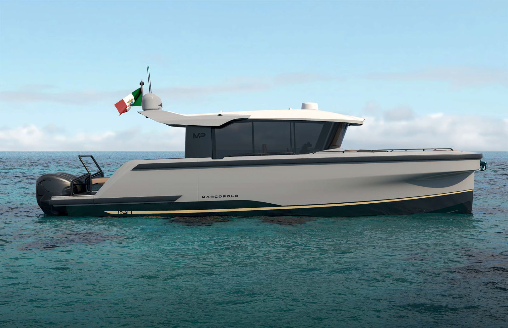 Это была мировая премьера: в январе лодку впервые представили публике, выбрав для показа одну из самых значимых выставочных площадок Европы. Что удивительно, Marcopolo Adventure Yachts была основана всего‑то в 2025 году — и сразу Дюссельдорф! Внешний дизайн, интерьеры, технический проект MP12 разработали в креативной студии Roberto Delfanti Design Lab (Парма), хотя обычно этим занимаются контрагенты. В проекте принял участие Розарио Алькаро, президент и генеральный директор Marcopolo Adventure Yachts, признанный лидер, человек с богатым опытом работы в морской отрасли — до этого он занимался брендом Invictus. А построили лодку на верфи 3AF Shipyard на Сицилии; по всей видимости, там же располагается и Marcopolo Adventure Yachts.
