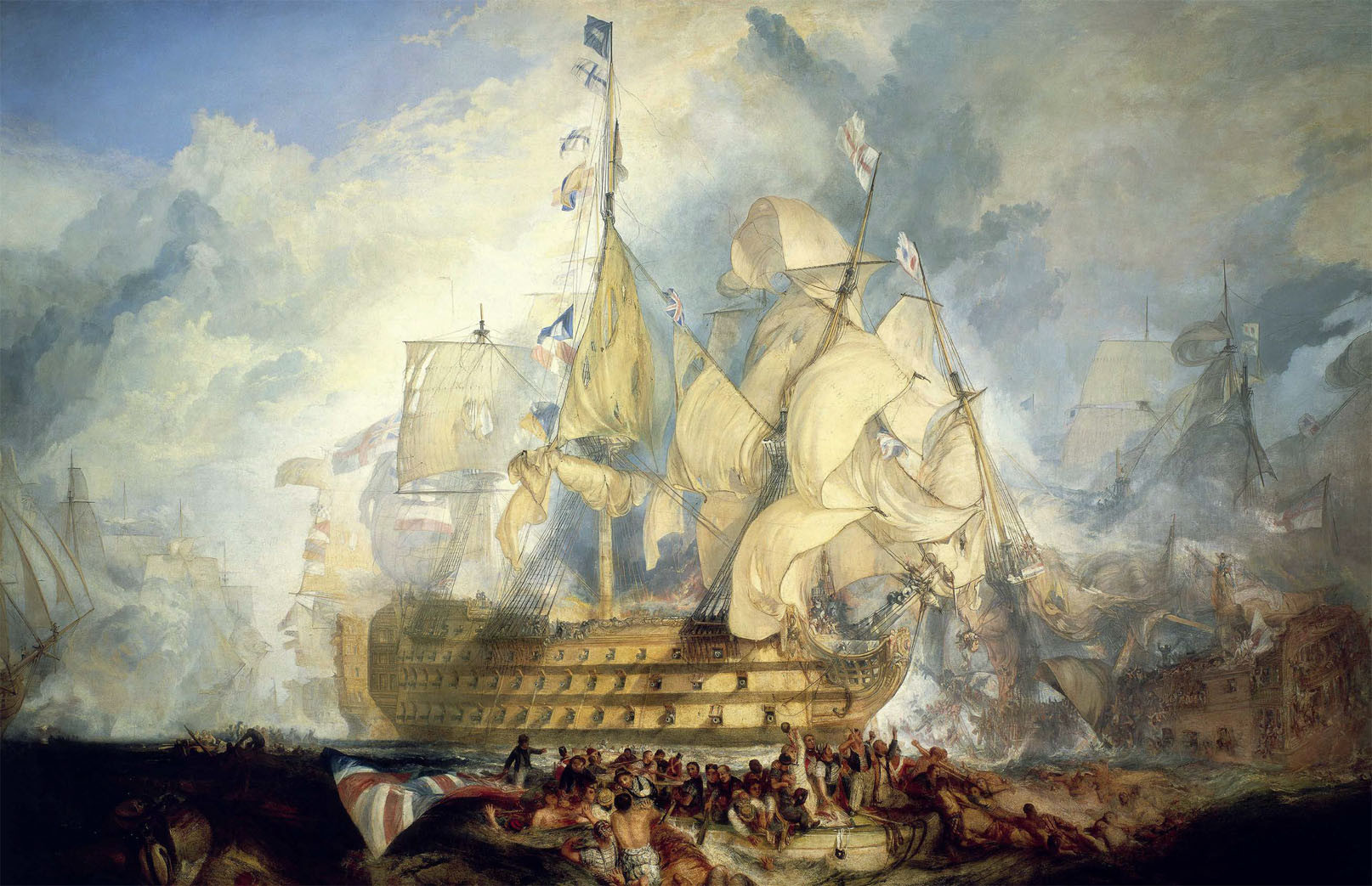Художник У. Тёрнер так изобразил Трафальгарское сражение, во время которого 27 британских линейных кораблей сошлись с 33 французскими и испанскими линейными кораблями. Британцы победили