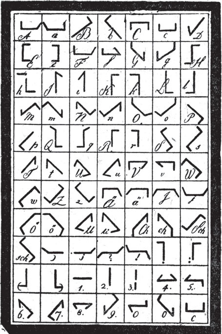 Первая азбука Клода Шаппа. Из книги И. У. Будовница «История телеграфа» (1937)