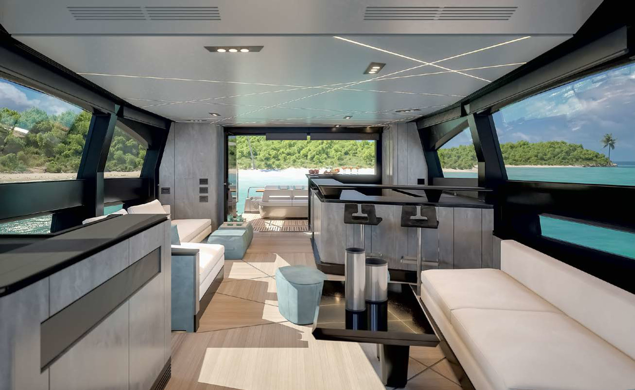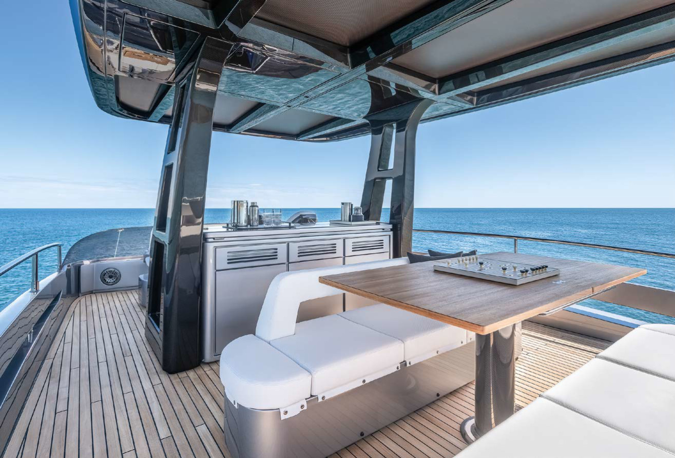 В обстройке просторного флайбриджа, логичного для лодки Gran Turismo, неизменными остаются лежак для загорания и регулируемый по высоте стол в корме, ветбар с мойкой, варочной панелью и холодильником и карбоновый пост управления. Остальное — вариации: дополнительные сиденья у динетты, одно или три кресла у наружного поста управления (как было в Венеции). Два многофункциональных дисплея украшают приборную панель, но об органах управления и приборах мы еще поговорим дальше.