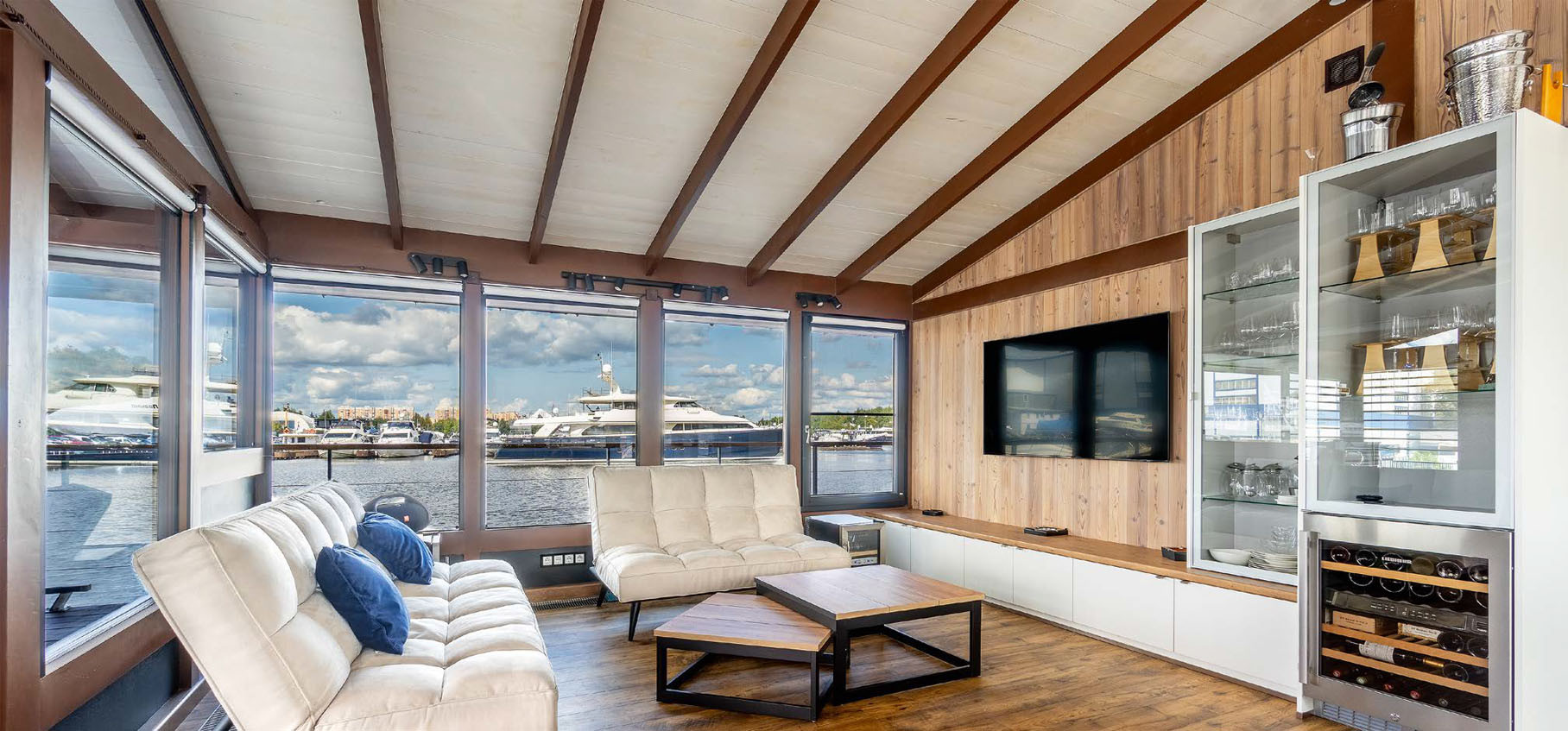 Раз уж мы сравнили этот хаусбот с яхтой, стоит рассказать об особенностях его конструкции. Тем более нам удалось обсудить их с самим автором проекта. «Этот проект гораздо больше отношения имеет к яхтам, нежели большинство хаусботов, которые мы видим вокруг, — поделился Тимофей Артемов. — Он уникальный, мы придумывали его вместе с владельцем так, чтобы это была одновременно и очень хорошая яхта со всей необходимой инженерией, и очень комфортабельное жилье. Концепцию заимствовали именно из мира яхт: практически любой конструктивный элемент, который вы тут видите, является элементом жесткости. Так строятся все суда, все яхты. Это позволяет создать конструкцию не слишком тяжелую, без большой осадки (в нашем случае — всего 0,8 м). Все же объект задуман как передвигающийся по акватории, значит, ему должно быть легко это делать. “Корабельная” основа хаусбота выполнена из композитного материала: для создания трех корпусов, разделенных на множество отсеков для повышения живучести, используется многослойный “пирог” из дерева и полимерного материала. Опыт применения такого композита в нашей компании очень