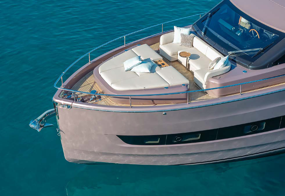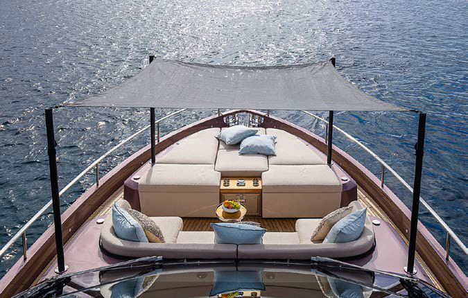 Просторные проходы вдоль борта ведут в носовую часть. Зона отдыха здесь оборудована диваном и большим лежаком для загорания. В проходе между ними можно поставить столик, а всю палубу накрыть тентом на карбоновых стойках. Дополняют зону отдыха встроенный холодильник, беспроводная зарядная станция и стереосистема.