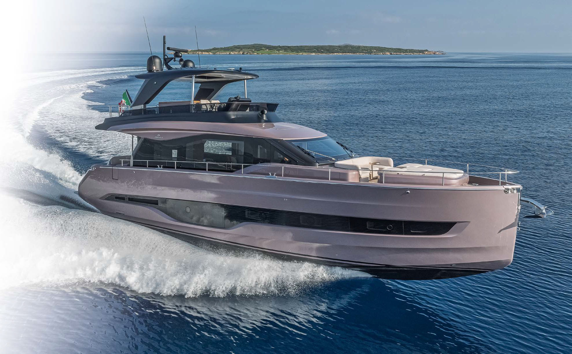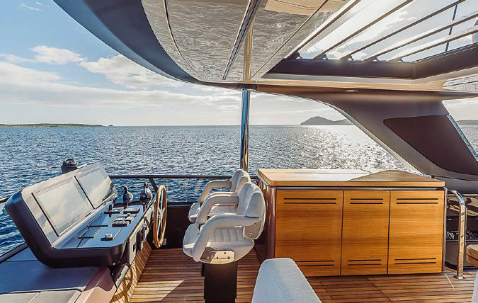 При проектировании флайбриджа перед Кристианом Гранде не стояла задача поразить чье‑то воображение. По его мнению, впечатлять и удивлять можно и без вау-эффекта: люди, которые выбирают Cranchi, опытны и ценят изысканный стиль и функциональность, а не только модные решения. Поэтому он спроектировал максимально удобную и довольно просторную открытую палубу, которая в хорошую погоду наверняка будет притягивать гостей. Сюда из кокпита ведет трап по правому борту. Вдоль левого борта протянулся мягкий диван, кормовая часть которого — это лежак-«солярий» (2,10 × 1,86 м). Складной стол у дивана формирует обеденную зону, а напротив расположен камбузный модуль из натурального тика со встроенным грилем, электроплитой, мойкой и льдогенератором. В передней части флайбриджа есть открытый пост управления с дизайнерской рулевой консолью и двумя креслами: для шкипера и штурмана. На приборной панели — два картплоттера с полным набором необходимых на современной яхте органов управления. Значительная часть площади палубы накрыта хардтопом с поворотными жалюзи (электропривод), регулирующими интенсивность потока солнечных лучей от нуля до максимума.