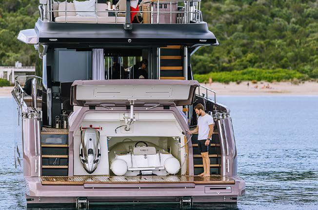 На борт моторной яхты чаще попадаешь через кормовую платформу. У Cranchi Sessantadue 62 она опускаемая, очень просторная, удобная для купальщиков, дайверов и пассажиров, садящихся в тендер. Williams TurboJet 285, как и множество разнообразных водных «игрушек», помещается в гараже, вход в который тут же, с купальной платформы. Однако в кокпит, который на несколько ступеней выше платформы, можно пройти прямо с причала по трапу (гидравлический трап предлагается как опция), выдвигающемуся по нажатию кнопки. Здесь оформлена обеденная зона на 8–10 человек из мягкого дивана вдоль транца и раскладывающегося тикового стола. В кокпите чувствуешь себя как на террасе загородного коттеджа. Это ощущение вызывают планки тикового паркета на палубе и в подшивке свеса флайбриджа, такие же, как и в салоне, куда мы скоро заглянем.