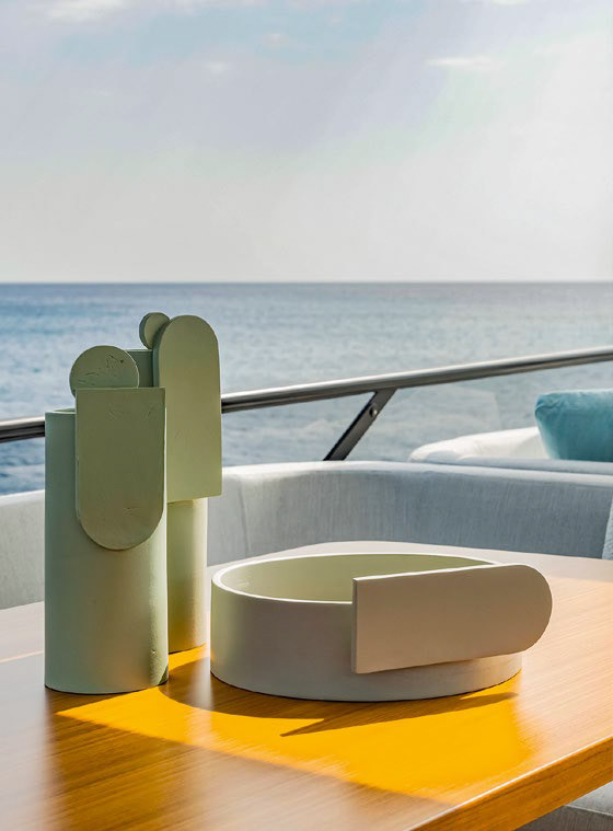 На флайбридже рулевая консоль занимает привычное место на правом борту, напротив дизайнеры поместили С-образную динетту с тиковым столом. На этой открытой палубе также есть зона для загорания, «островной» ветбар с холодильником и ТВ-экраном на подъемнике; помимо лежаков, в корме хватило места для тендера с габаритами 3,3 × 1,7 м. На фордеке обустроена зона отдыха с диваном и еще одним лежаком, большим и трансформируемым.