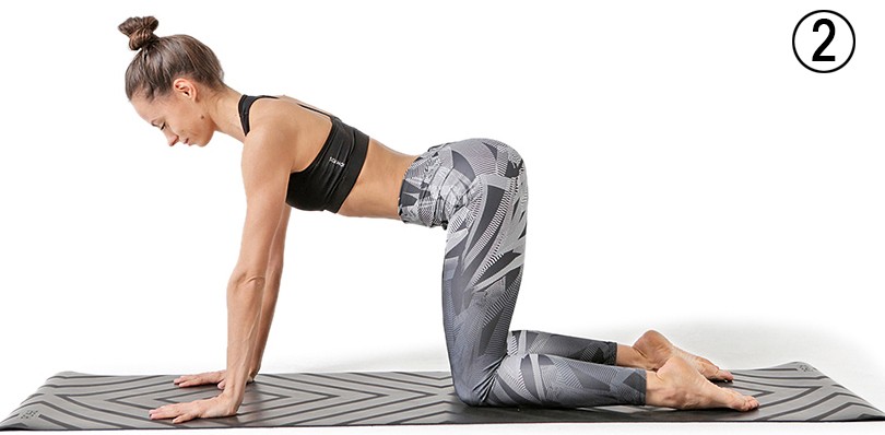 ► Проворачиваем таз копчиком вверх, подвздошными костями вниз. Не меняя положение таза, подтягиваем живот, уводя нижние ребра внутрь (2). Прижимаем плотно ладони к полу, подворачиваем стопы на пальцы и с выдохом поднимаем таз вверх.