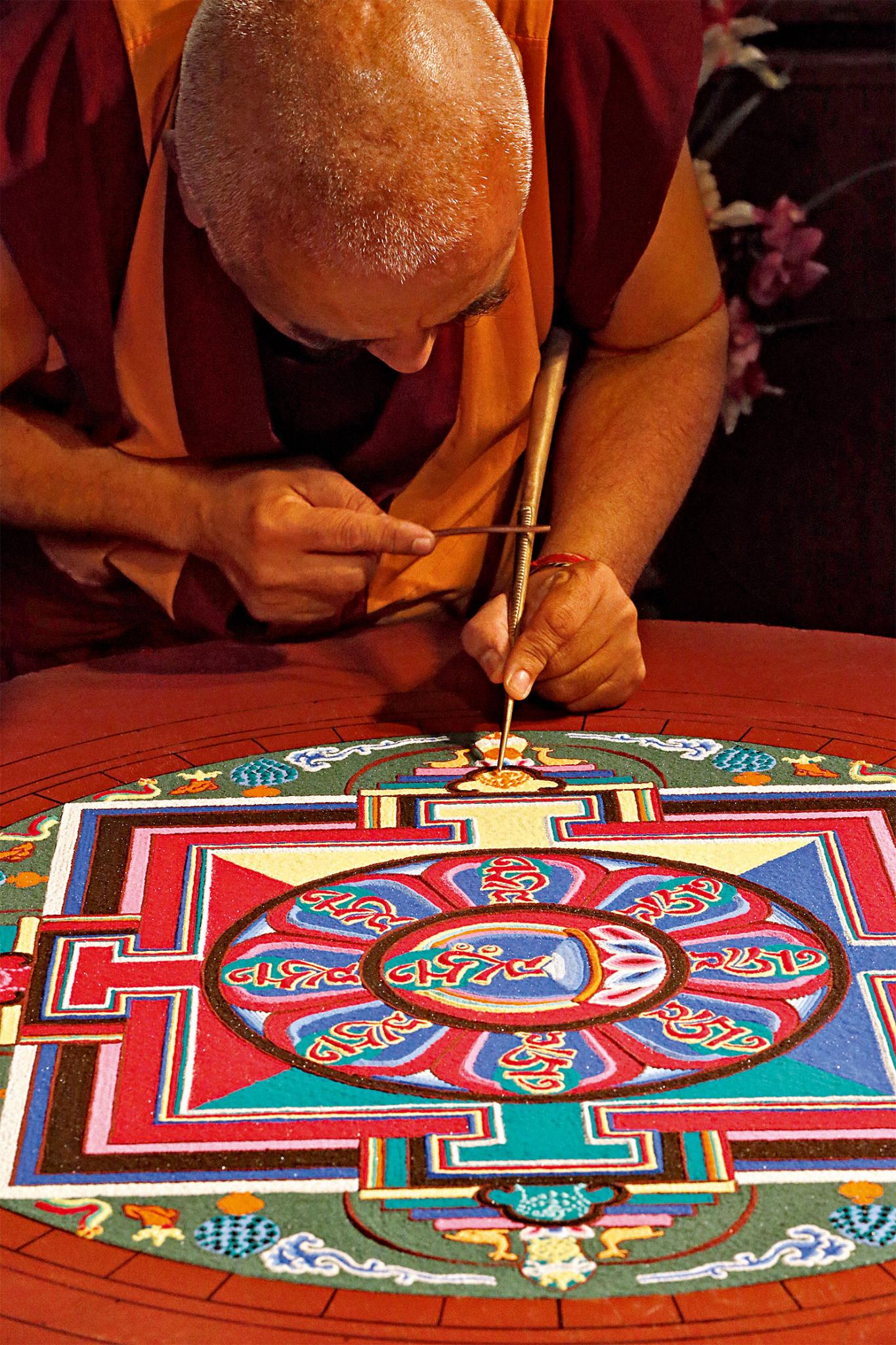 В день встречи с монахами я почти ничего не ел. Несколько часов шёл вдоль одиноких дюн, закутанный в шерстяной свитер, — когда вдруг набрёл на небольшой районный культурный центр недалеко от моего старого отеля. Вывеска у входа гласила «Наслаждайтесь тибетской культурой и искусством». Внутри шесть буддистских лам из монастыря в Индии тихо сидели вокруг платформы. Шёл второй день их недельного проекта по созданию песчаной мандалы — метафоричного изображения вселенной, составленного из миллионов песчинок ярко раскрашенного песка.