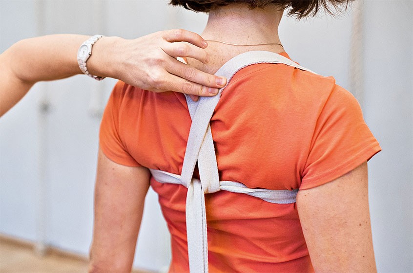 Разворот плеч изнутри наружу, направление трапециевидной мышцы от шеи, лопаток и грудного отдела позвоночника внутрь спины — ключевое движение, которое надо освоить при работе с проблемами шеи. Обучить мышцы рук и верха спины правильной работе можно, используя шлейку из ремня на плечи.