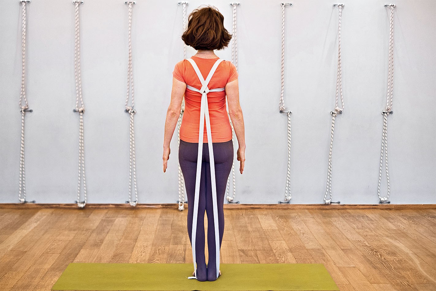 Чтобы качественно поместить ремень на плечи, была бы полезна помощь учителя, но вы можете научиться надевать ремень и самостоятельно. Возьмите длинный ремень и сделайте большую петлю. Наденьте петлю на плечи как лямки рюкзака. Верхнюю часть петли поднимите вверх, перекрестите, чтобы обе части ремня расположились ближе к шее и захватили трапециевидную мышцу, протащите под нижней частью петли, обхватите её, а затем оттяните вниз. Встаньте стопами в петлю. Если ремень недостаточно длинный, возьмите второй ремень удлините петлю так, чтобы её можно было надеть на пятки. Согните немного ноги в коленях, подтяните конец ремня и выпрямите ноги, давя пятками в пол, чтобы ремень оттягивал трапециевидную мышцу от шеи и направлял лопатки и грудной отдел позвоночника внутрь спины. Следите за поясницей, она не должна прогибаться. Не смещайте плечи назад, а таз вперёд, это может произойти, если петля очень короткая. С таким ремнём вы почувствуете пространство и удлинение в шее, лёгкость в голове, она как бы вырастает вверх и парит.