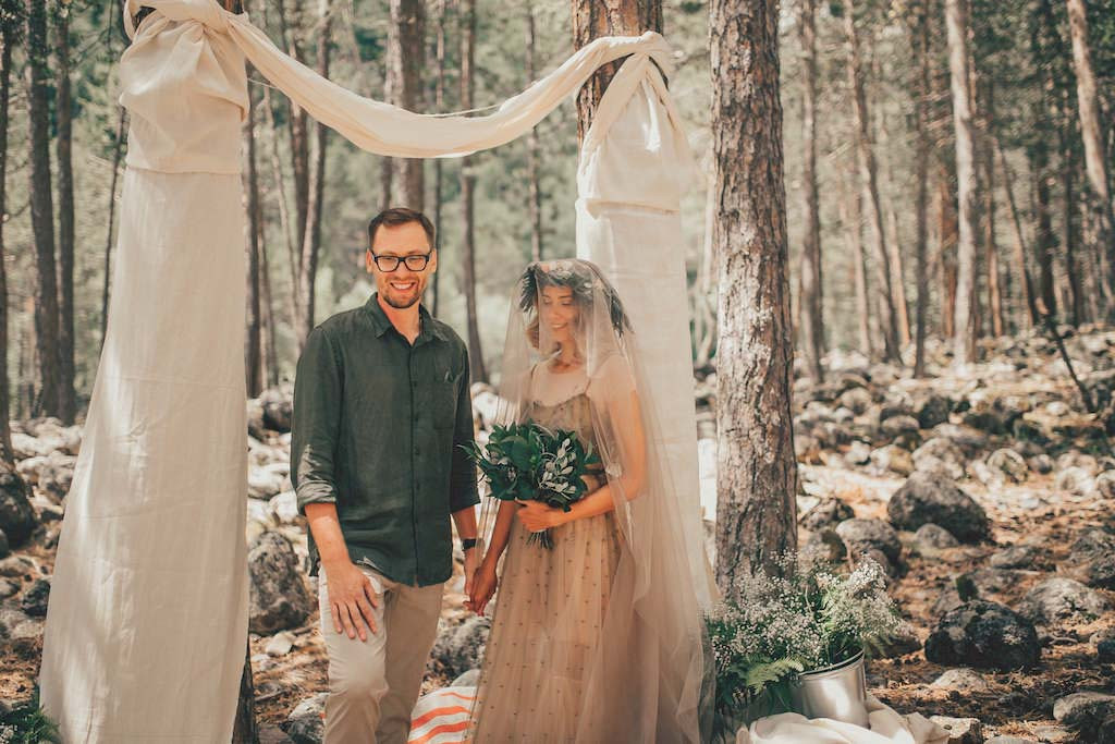 Мы сняли целиком отель, который находился среди огромных сосен. Нашли замечательную полянку для церемонии. Я придумала, как всё обставить и украсить. Акцент был на природе, потому что она там очень красивая, без всякого декора. Наряды тоже выбирались в контексте места – что-то максимально природное и простое. Большую часть продуктов и напитков мы везли с собой. Нам удалость найти местных поваров, а всё устроить помогали работники отеля, за что им огромное спасибо. Мы не пользовались услугами по организации, всё делали вдвоём с мужем. Ведущего у нас тоже не было, да он и не был нужен. Придумывать особую программу нам не пришлось: гости гуляли, поднимались на канатной дороге в горы – словом, наслаждались тем, что вокруг. После самой церемонии мы со всеми желающими поднялись на ратраках (то ещё было приключение!) под седловину Эльбруса на высоту 5100 м. Парни спускались оттуда уже на сноубордах и лыжах. Вечером у нас были танцы у костра под открытым небом. Не помешал даже дождь: все были счастливые, хоть и мокрые. Если бы мне пришлось ещё раз организовывать свадьбу, я бы снова сделала всё, как тогда, потому что это было невероятно круто.