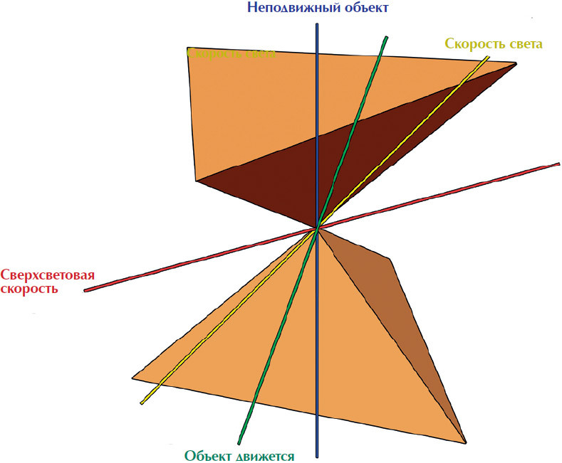 Для метрики второй степени (метрика пространства Минковского) мы видим два световых конуса – это наша трехмерная Вселенная. Линия, совпадающая с вертикальной осью обоих конусов, означает, что объект неподвижен. Любая другая прямая, лежащая в пределах этих конусов, будет восприниматься неподвижным наблюдателем как объект, имеющий скорость. Линия на границе конусов означает, что объект двигается со скоростью света. Согласно постулатам теории относительности, движение тел со скоростью больше световой невозможно. В пространстве Минковского движение со сверхсветовой скоростью выходит за пределы световых конусов.