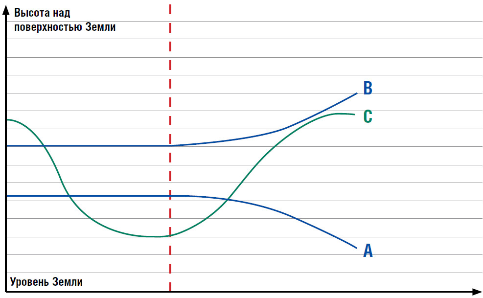 Давайте попробуем рассмотреть такую модель чуть подробнее. Возьмем эту воронку с ее геодезическими линиями и распрямим, чтобы нам было лучше видно и понятно, как именно движутся объекты в ней. Нарисуем небольшой график: по оси Х находится уровень Земли, а по оси У откладываем высоту над поверхностью Земли. Линии – это траектории спутников на разных высотах и скоростях над Землей.