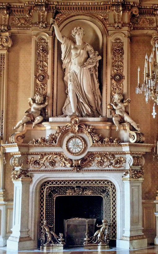 Когда пышные формы начали утомлять глаз, в Европу пришел классицизм, возвращая строгие пропорции и четкость линий античных времен. На каминах стали изображать военные эмблемы и древние орнаменты, но украшения стали более лаконичными. Порталы обрамлялись колоннами и скульптурами, на карнизе размещались часы и статуэтки, а над камином – зеркала.