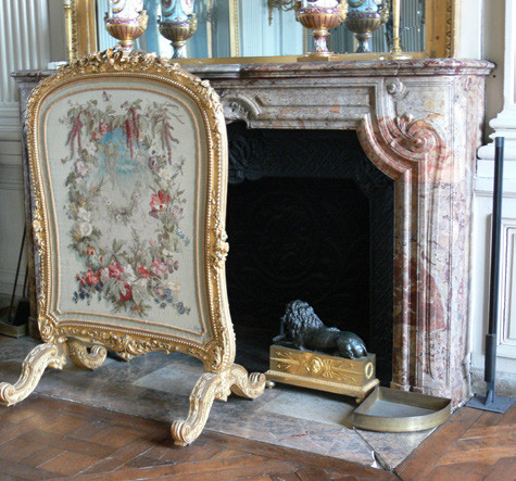 Декоративные орнаменты становились ассиметричными и динамичными, с изображениями растений, животных и детей. Задняя стенка топки закрывалась чугунными панелями с рельефами на библейские темы или военными сценами. Часто использовался белый мрамор в сочетании с золоченой бронзой. На каминной полке размещались часы, вазы и канделябры, а перед топкой ставился шелковый экран в рамке, который усиливал декоративный эффект и рассеивал тепло.