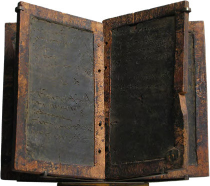 Складывались такие восковые дощечки воском внутрь и соединялись по две (диптих) или три (триптих) штуки или по несколько штук (полиптих) кожаным ремешком – и получалась книжка, прообраз средневековых кодексов и дальний предок современных книг. Изготовить таблички было несложно, поэтому в Античности и Средневековье восковые таблички использовались в качестве записных книжек, для хозяйственных пометок и для обучения детей письму. Подобные вощеные таблички были и на Руси, и назывались они церы.