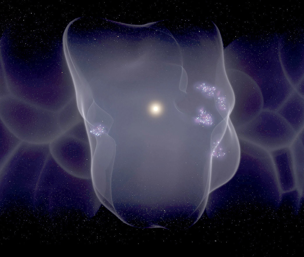 Когда вспыхивали первые сверхновые, Солнце было за пределами пузыря, но теперь оно находится практически в его центре, поэтому мы и можем наблюдать равномерное свечение со всех сторон, что ошибочно принимают за эхо Большого взрыва.