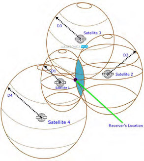 Имея данные от трех (а лучше четырех) спутников, методом триангуляции можно вычислить координаты пользователя. По расстоянию лишь до одного космического аппарата сделать это нельзя – приемник может находиться в любой точке сферы вокруг спутника. Данные от второго аппарата сужают область нахождения приемника до окружности. Информация третьего спутника дает наличие двух точек, одна из которых лежит на поверхности, вторая либо в небе, либо прямо под землей. И только данные четвертого спутника позволяют однозначно определить координаты.